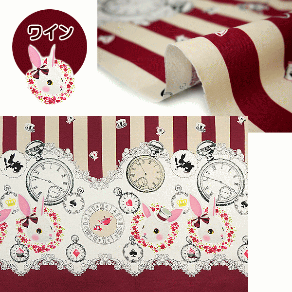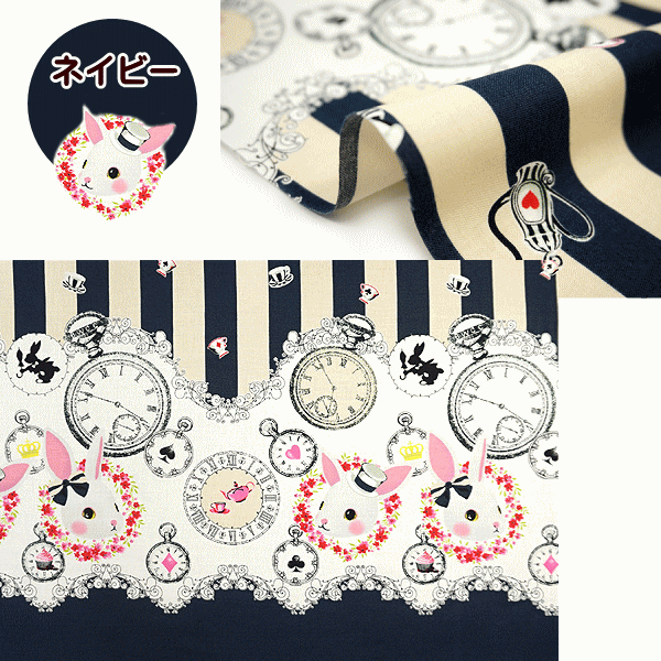 ■生地をご購入の前にお読みください シーチング 生地 アリスのうさぎ ボーダー 懐中時計 手芸 通園 通学 入園 入学 レッスンバッグ 小学生 かわいい 女の子シーチング生地 (アリスのうさぎ ボーダー) アリスの世界から飛び出してきた キュートな表情が可愛いうさぎ♪