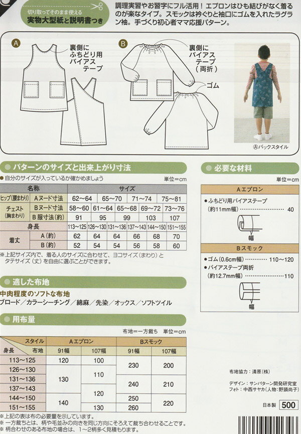 実物大型紙・小学生 エプロンとスモック こどものエプロンパターン♪