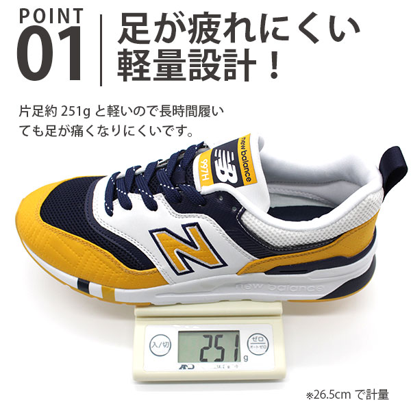 有料ラッピング対応ブランド:New Balance ニューバランス 商品名/品番:CM997H 素材:アッパー:人工皮革 合成繊維、アウトソール:ゴム底 ワイズ(横幅):細身のD 靴の詳細:(26.5cm採寸) ソール高:約 4.0cm 履き口までの高さ:約 11.0cm(ソール部分も含む) 履き口周り:紐を結んで調節出来ます 重量:約 253g カラー [BY]イエロー/ネイビー 黄色/紺色 [BX]ブラック/レッド 黒色/赤色 着用時のサイズ感 細身、普通の方→「標準サイズ」 甲高、幅広の方→「0.5cm大きめ」 こちらのアイテムの足入れは標準です。