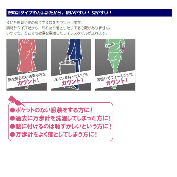 女性の腕にフィットする小型・軽量の腕時計型万歩計 ・女性の腕にフィットする小型・軽量モデル(腕時計タイプ万歩計では最小・最軽量) ・腕時計タイプ万歩計だから、気軽にデータをチェック ・歩数、歩行距離、消費カロリー、歩行時間、時刻、カレンダーを表示。